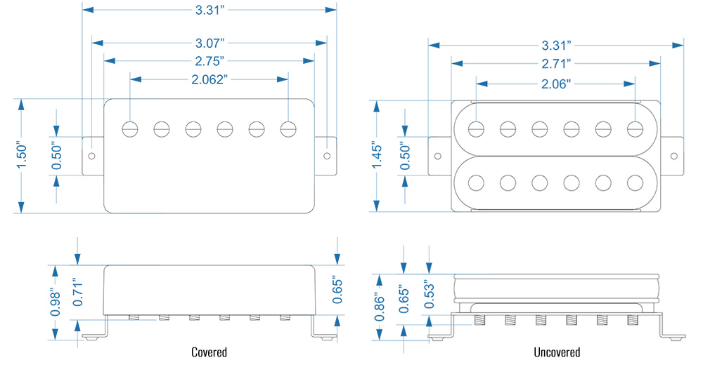 F-SPACED Imperial®은 Imperial® 험버커 와 동일한 사양을 자랑 하지만, 펜더 브릿지 포지션이나 와미 바가 장착된 기타에 맞게 폴 간격이 더 넓고 (폴 간격은 바깥쪽 두 폴의 중심 간 2-1/16인치입니다. F-스페이스에 대한 자세한 내용은 여기를 참조하세요 .) 배선은 4선으로만 구성됩니다.
